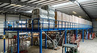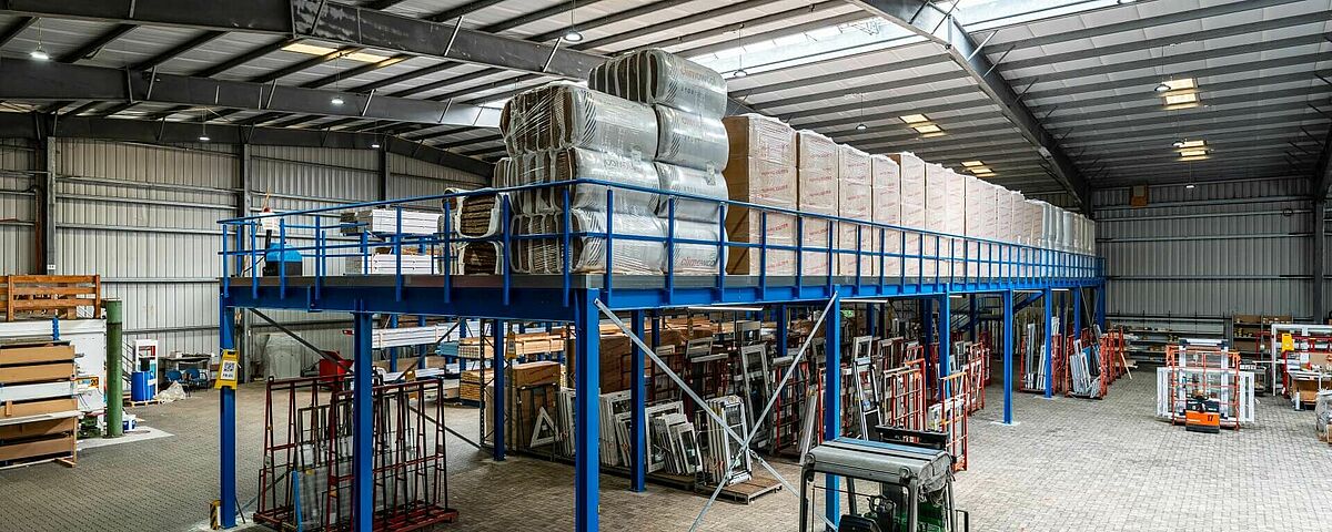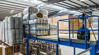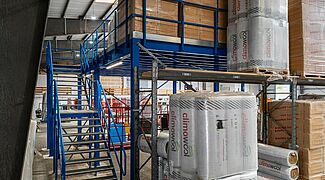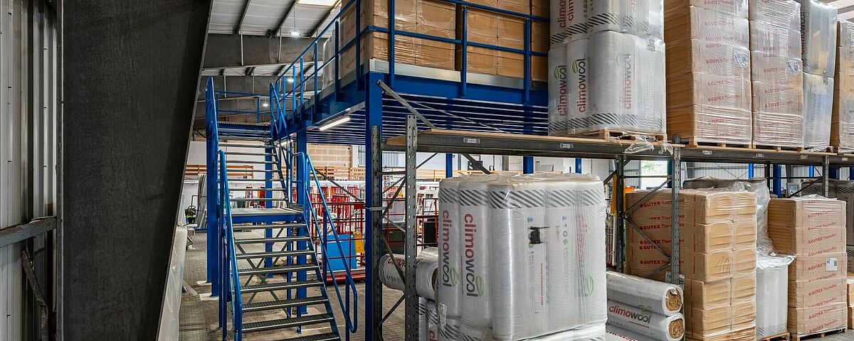 OHRA ha sviluppato un soppalco progettato su misura, adattando il carico utile, la posizione della scala e l'area di consegna delle merci alle caratteristiche specifiche del capannone esistente. Il soppalco ricopre un'area di dimensione di 33,8 x 8 metri, la capacità di carico è di 1.000 chilogrammi per metro quadrato ed è quindi assolutamente adeguata allo stoccaggio di pallet contenenti materiali isolanti. I supporti della struttura sono disposti secondo una griglia di 5 x 4 metri, la luce libera sotto trave è di 3,5 metri che rappresenta un ampio spazio di lavoro utilizzabile in modo flessibile. La pavimentazione è realizzata con pannelli di truciolare , la cui parte inferiore è verniciata di bianco. Insieme a una buona illuminazione e all'altezza generosa, il personale che lavora sotto il soppalco e ha a disposizione uno spazio di lavoro confortevole e piacevole.